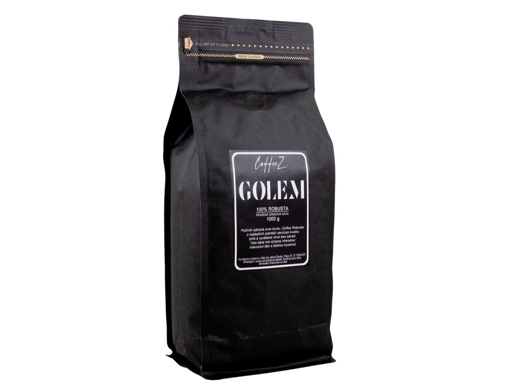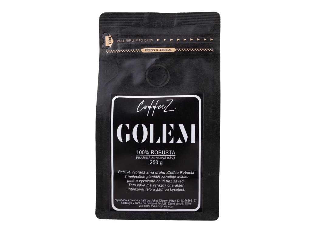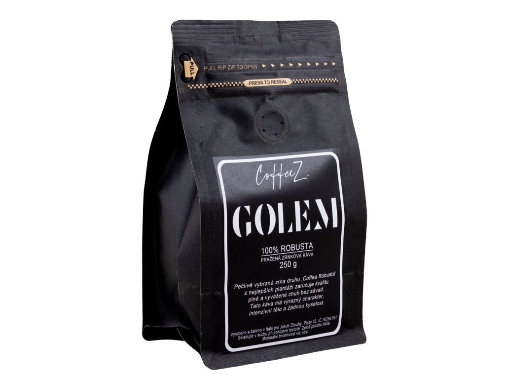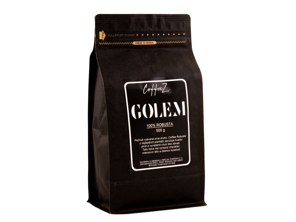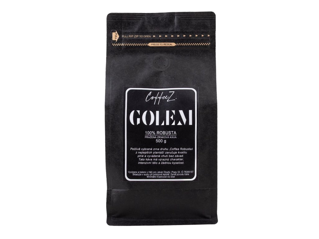 GOLEM je synonymem velikosti a síly. Káva obsahující odrůdu Robusta má mnohem vyšší podíl kofeinu a nižší kyselost oproti odrůdě Arabica. Směs zrn vybraných výhradně z Robusty je hodna jména takového formátu.